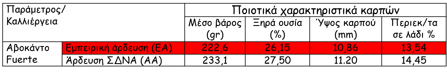 Ο χειρισμός άρδευσης (EΑ, ΑΑ) δεν επηρέασε σημαντικά τα ποιοτικά χαρακτηριστικά των καρπών της πορτοκαλιάς, της ακτινιδιάς, της πατάτας και της αραχίδας, ενώ στο αβοκάντο και στην ελιά τα ποιοτικά χαρακτηριστικά ήταν λίγο καλλίτερα στην άρδευση ΣΔΝΑ από την εμπειρική άρδευση.